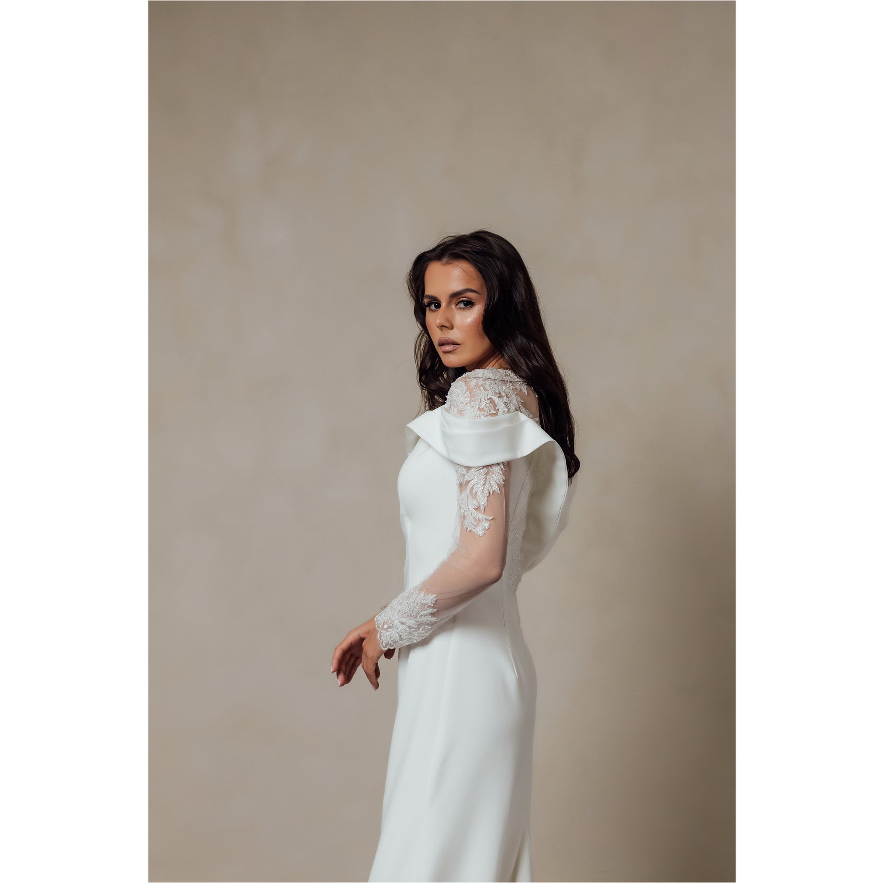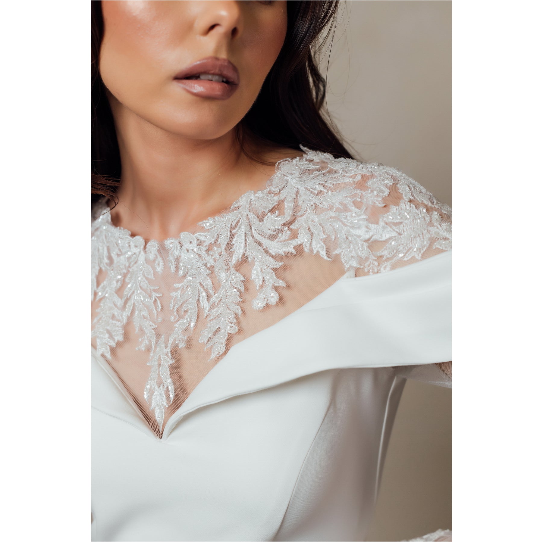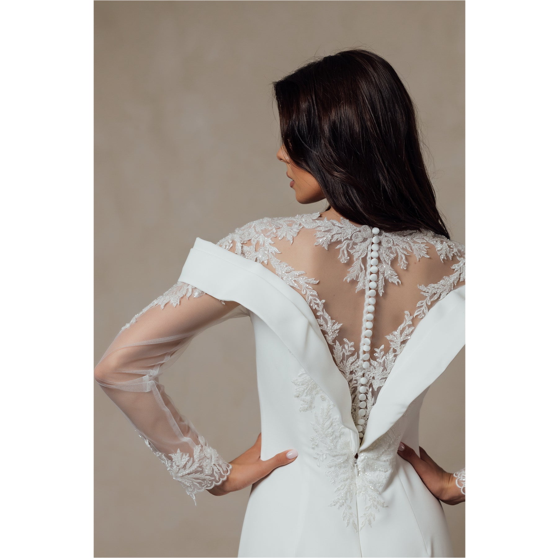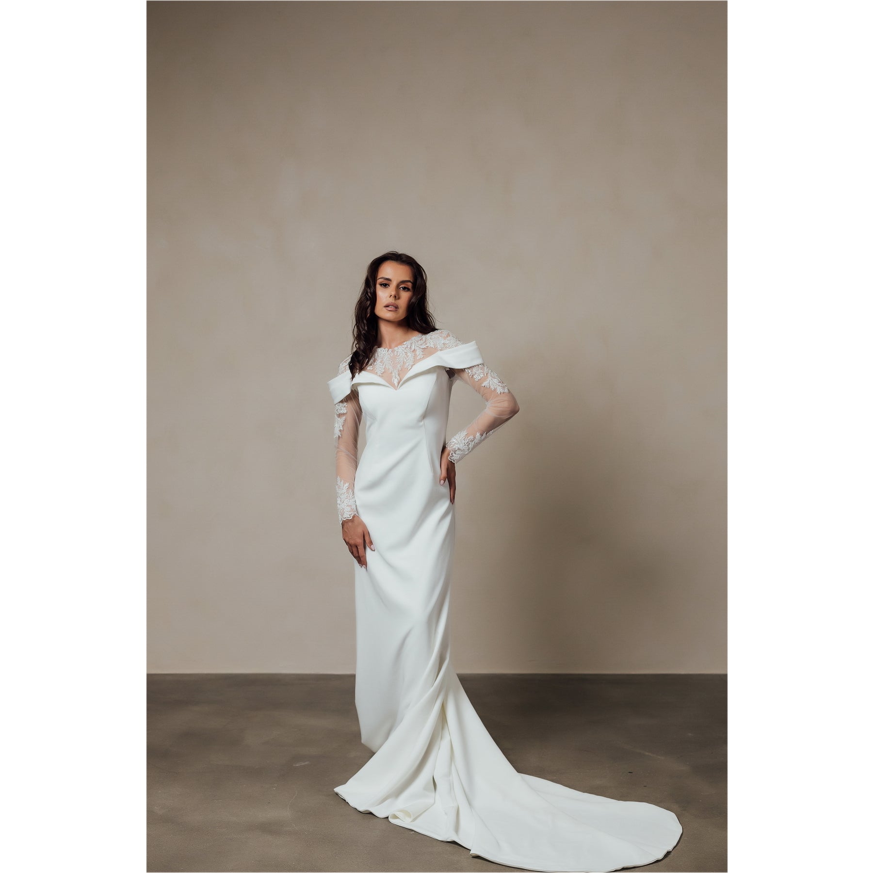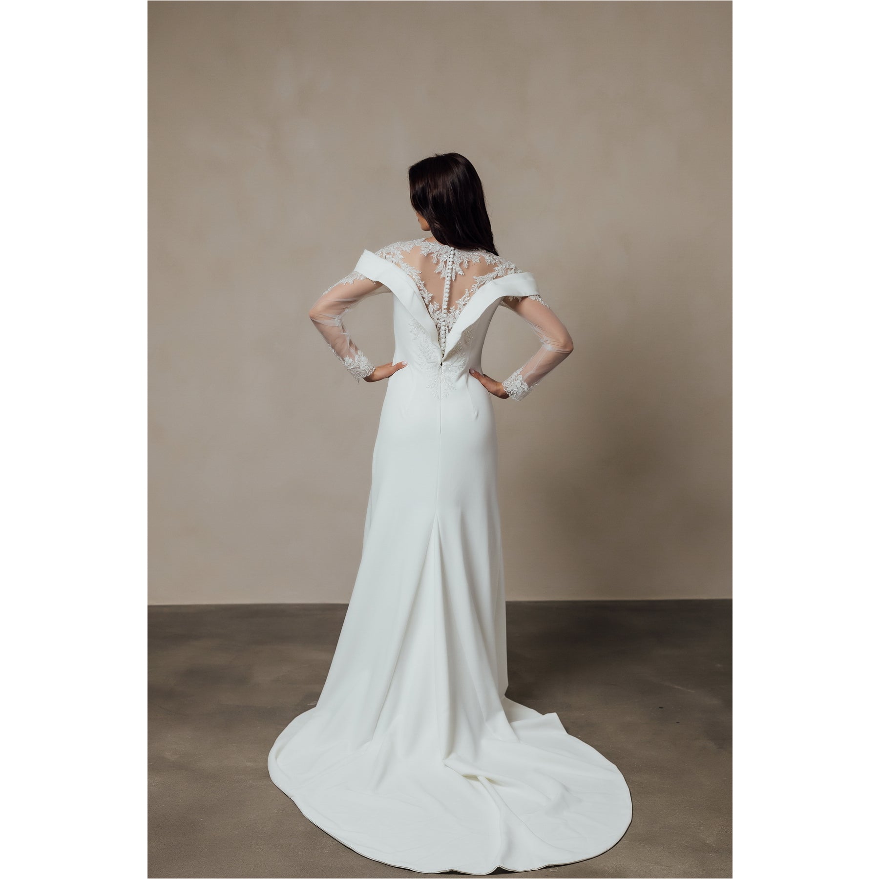 Questo abito da sposa stile sirena incarna l'eleganza del crepe che si adatta alle curve del corpo. Il corsetto dal design unico aggiunge originalità, mentre il pizzo applicato a mano conferisce lusso. Le maniche lunghe donano eleganza, creando un look sofisticato e audace per un matrimonio di classe. Un'opzione che sicuramente catturerà l'attenzione e lascerà un'impressione indelebile.