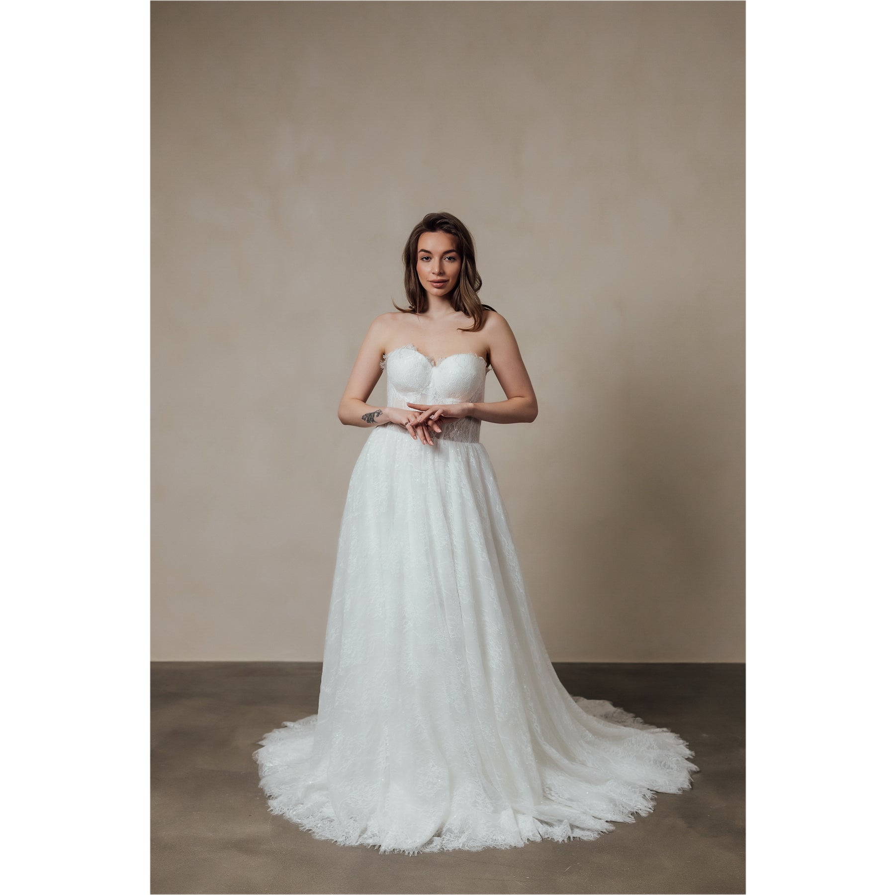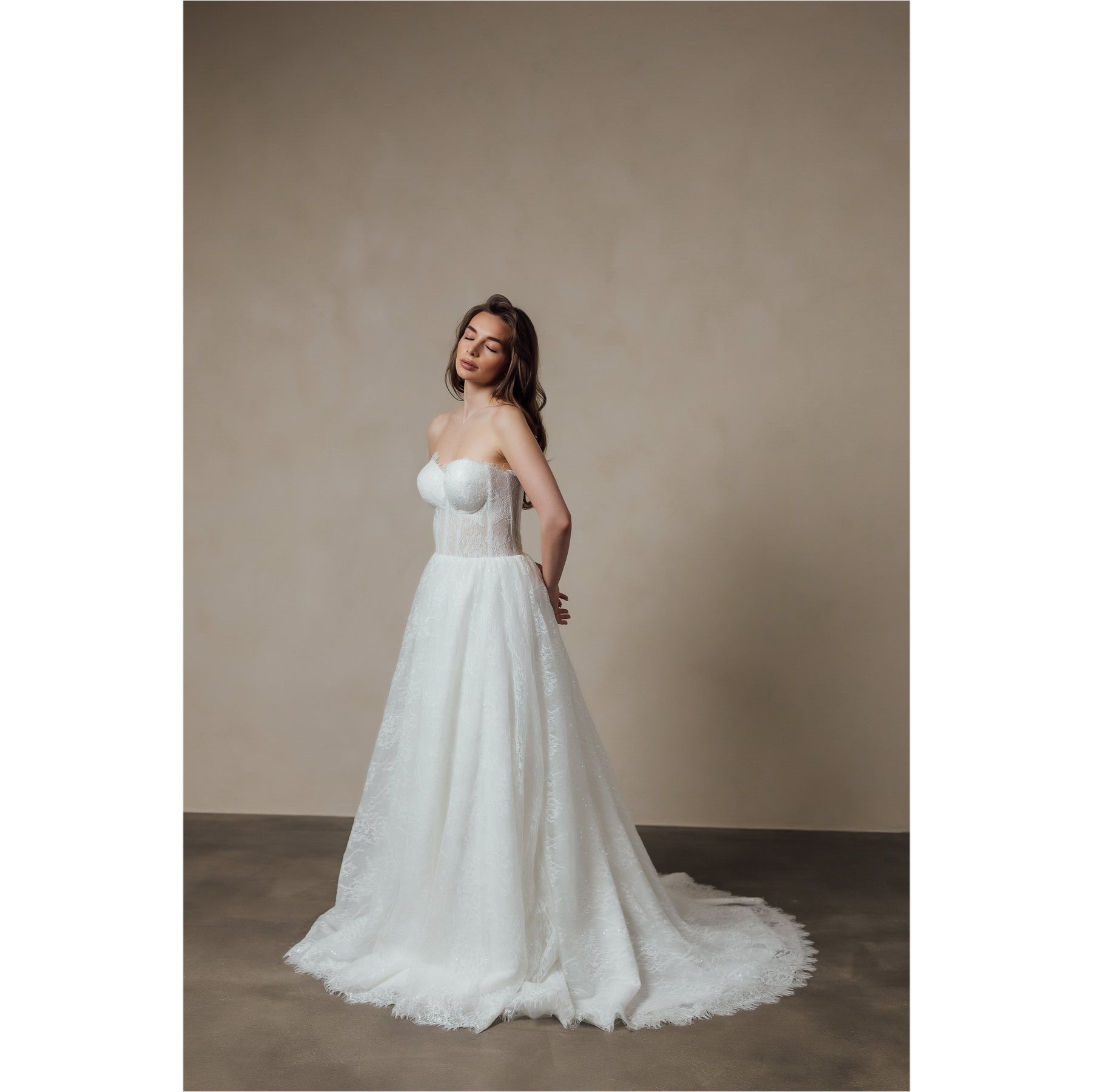 Questo abito da sposa incarna l'eleganza del pizzo Chantilly, un tessuto raffinato con motivi floreali trasparenti. Il corsetto a cuore accentua la femminilità, mentre l'uso completo del pizzo crea un look etereo e sensuale. Perfetto per spose che cercano un'eleganza romantica e sofisticata, sarà la scelta ideale per un matrimonio senza tempo.