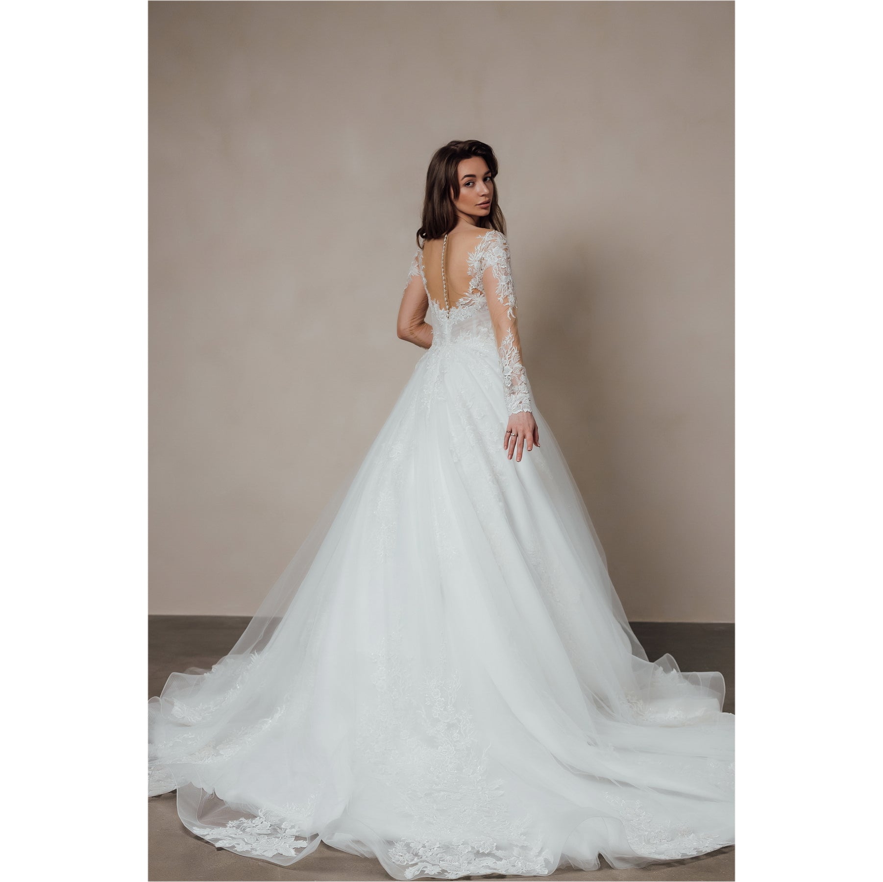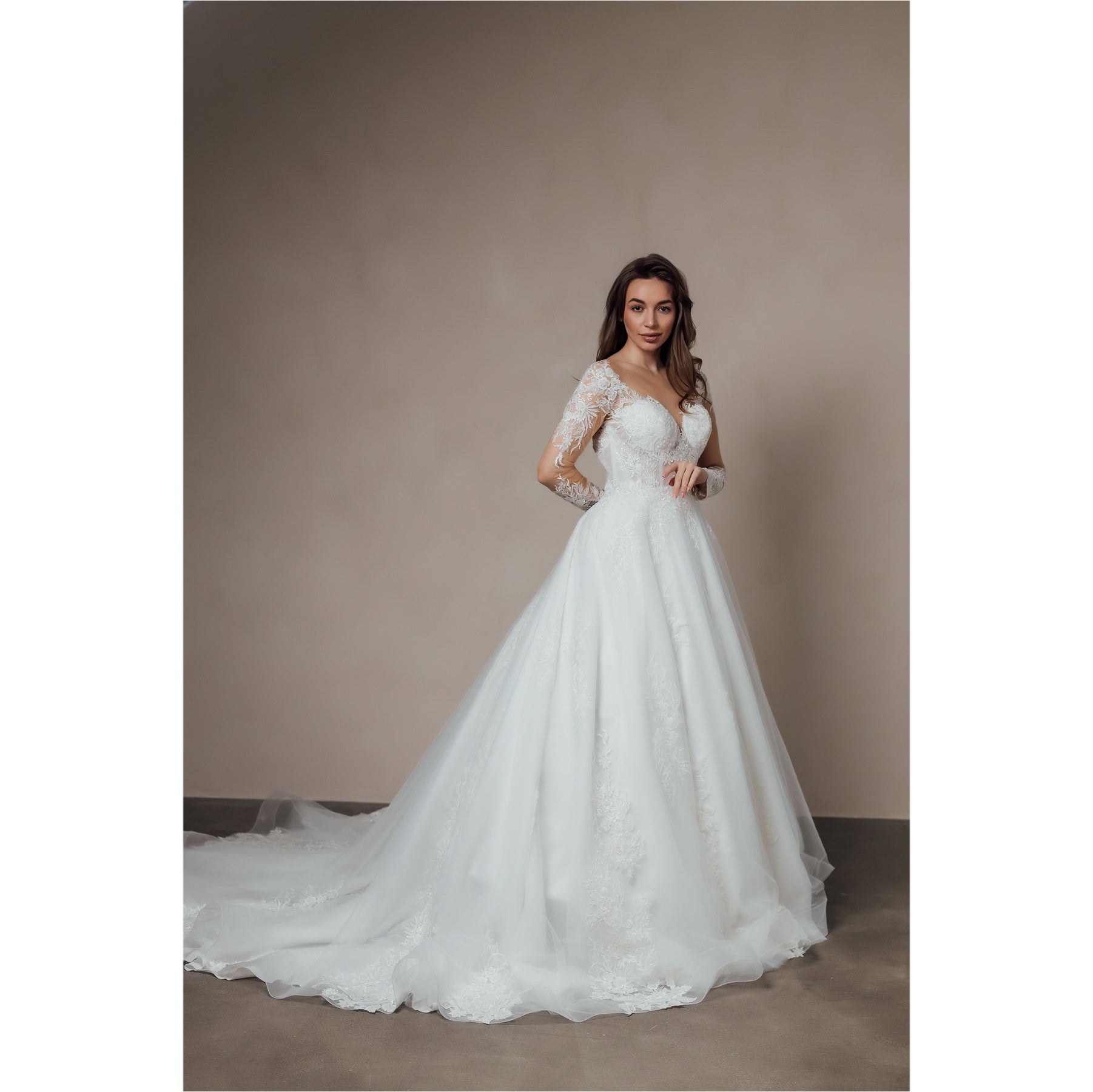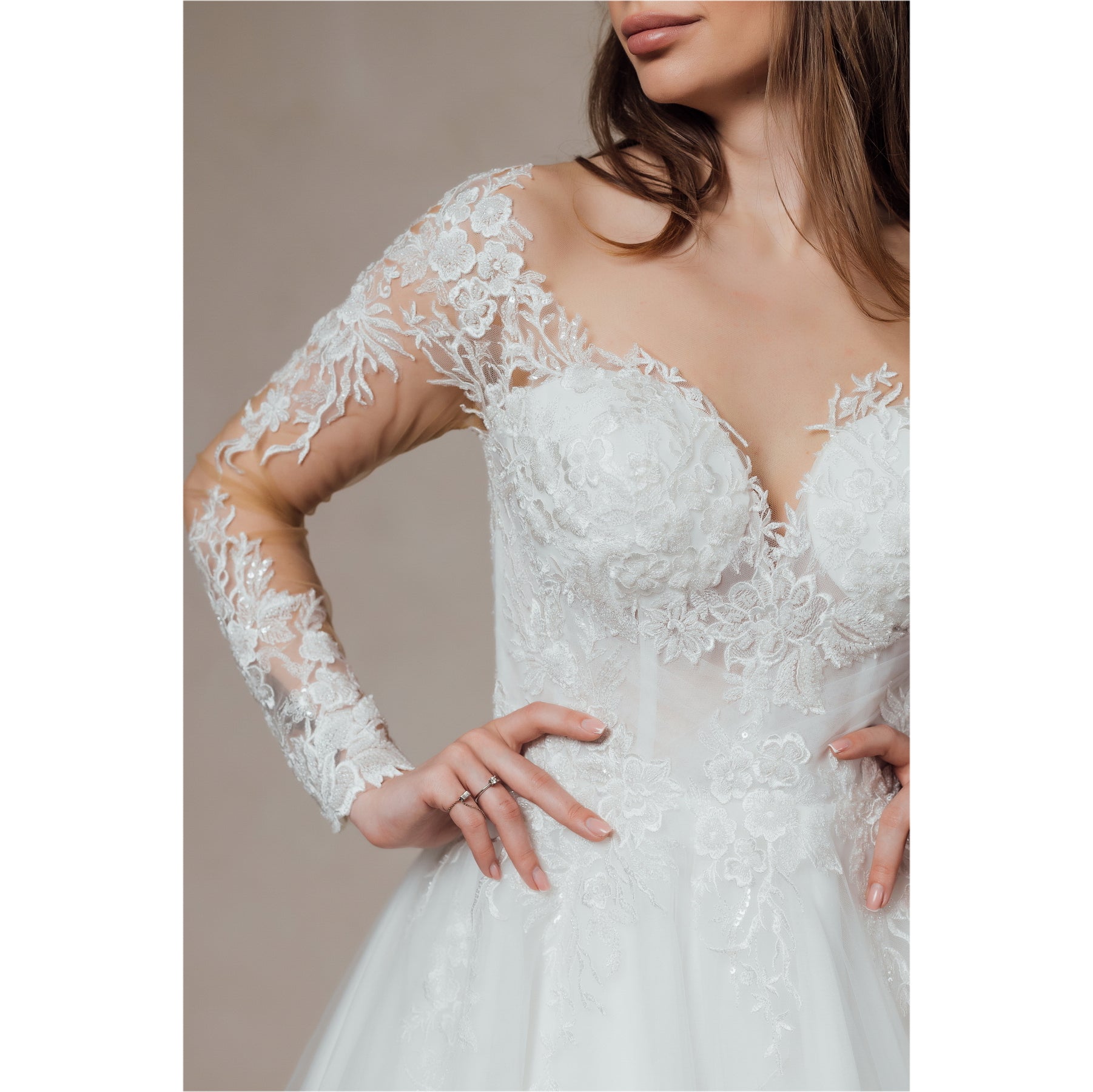 Lo stile principessa di questo abito da sposa crea un look da sogno con una gonna ampia in tulle e un corsetto dal décolleté a cuore. Le maniche lunghe e il pizzo prezioso conferiscono eleganza e sofisticatezza, mentre il pizzo che cade a cascata sulla gonna aggiunge un tocco fiabesco. La coda importante completa il look regale. Questo abito in tulle stile principessa lascerà tutti senza fiato. Grazie per l'attenzione e non vediamo l'ora di farvi provare questo capolavoro da vicino.
