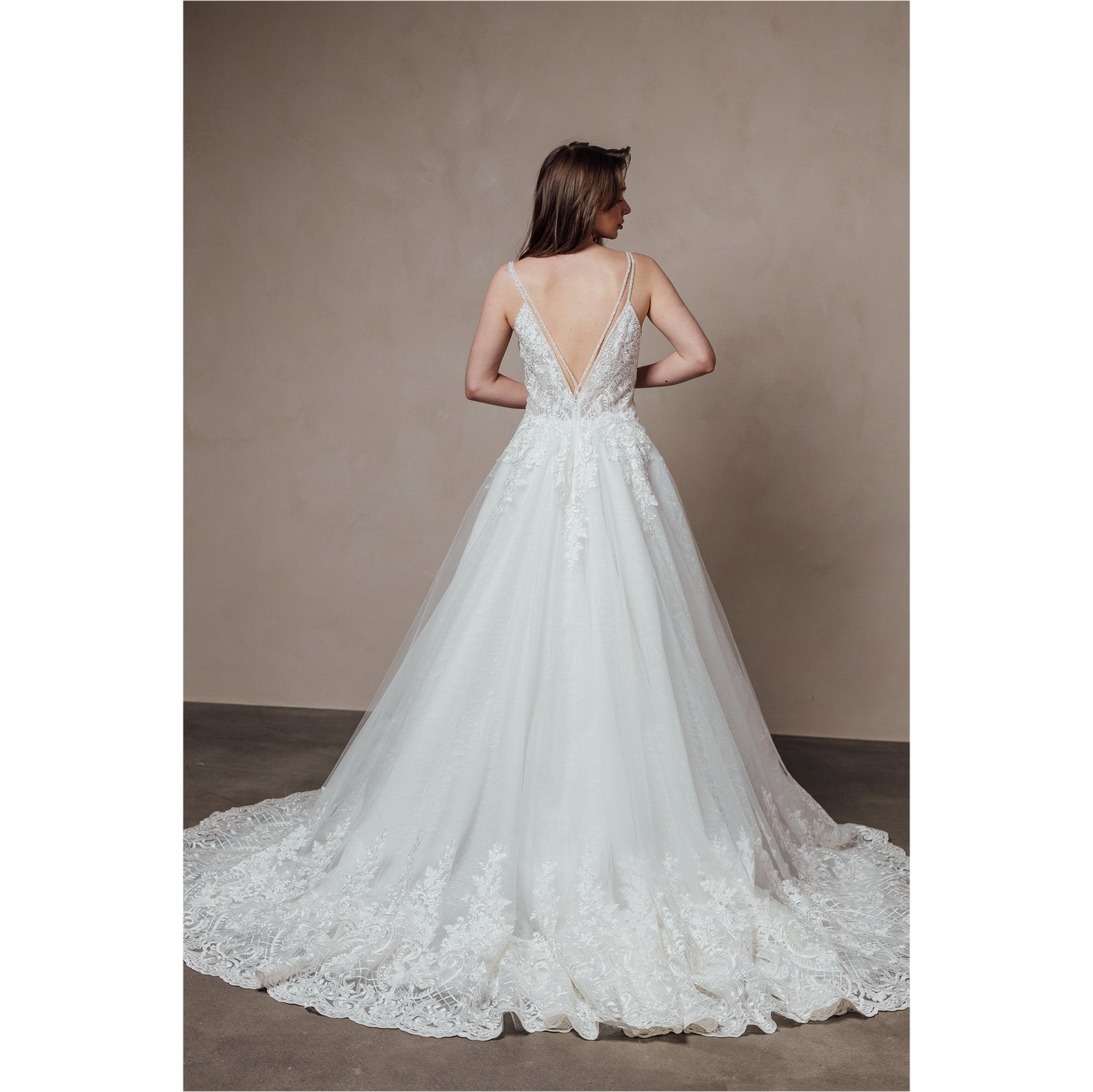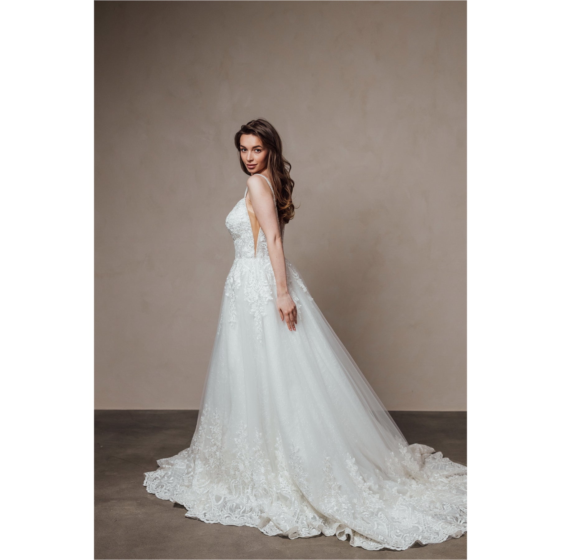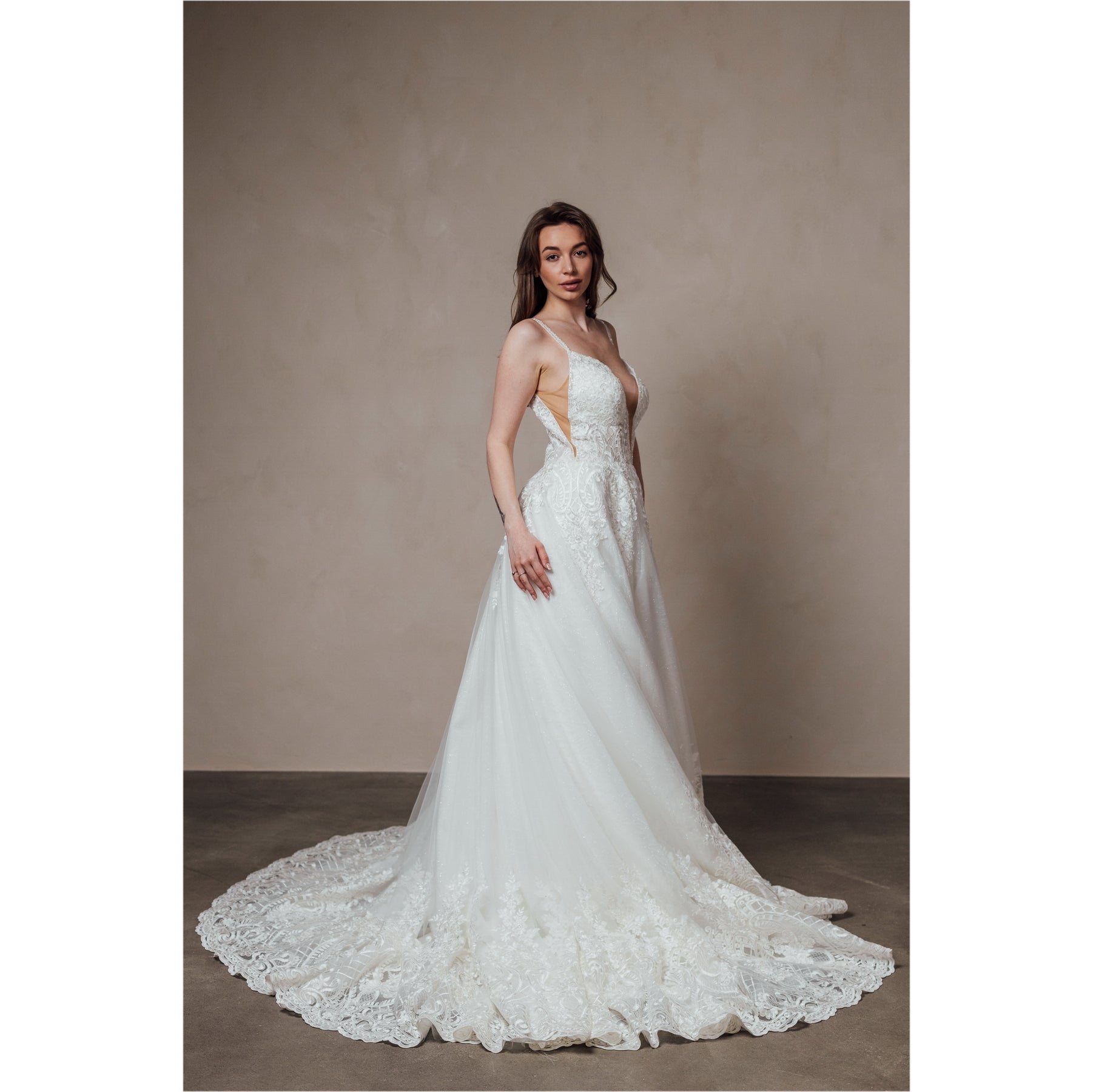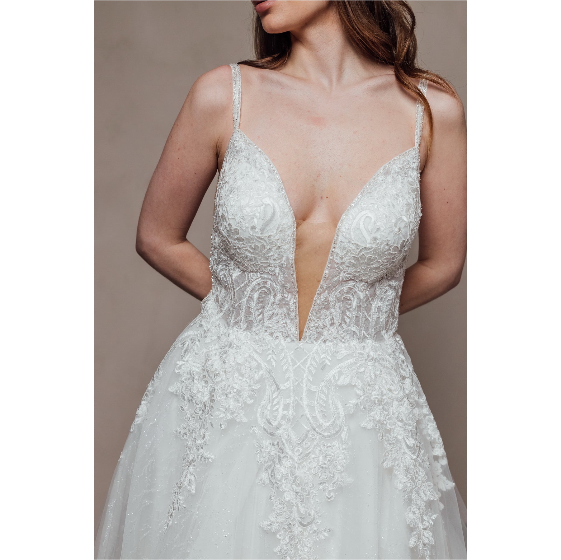 Siamo lieti di presentarvi il nostro magnifico abito da sposa in tulle, stile principessa, con una base glitterata. Il corsetto dal décolleté accentuato è sensuale, ricoperto da un pizzo unico e originale che scende sulla gonna. La base della gonna è interamente ricoperta dello stesso pizzo, creando un effetto di continuità e raffinatezza. Il tulle leggero e etereo crea una silhouette da principessa, mentre la base glitterata aggiunge un tocco di magia. Questo abito rappresenta un'opzione affascinante e di grande impatto per il vostro giorno speciale. Grazie e non vediamo l'ora di farvi provare questo splendido abito.