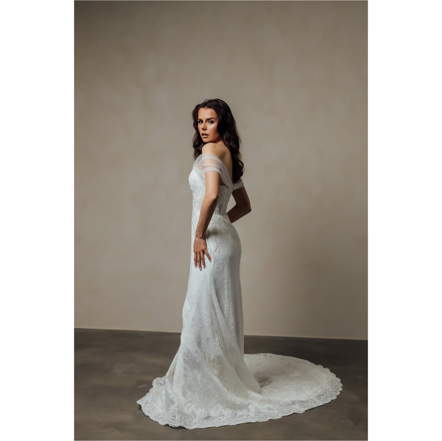 Siamo entusiasti di presentarvi il nostro spettacolare abito da sposa in stile sirena, con una base di prezioso pizzo chantilly sopra uno strato di tulle impreziosito da pizzo. Il décolleté profondo e le maniche cadute aggiungono un tocco sensuale e grazioso. Grazie e non vediamo l'ora di farvi provare questo unico abito da vicino.