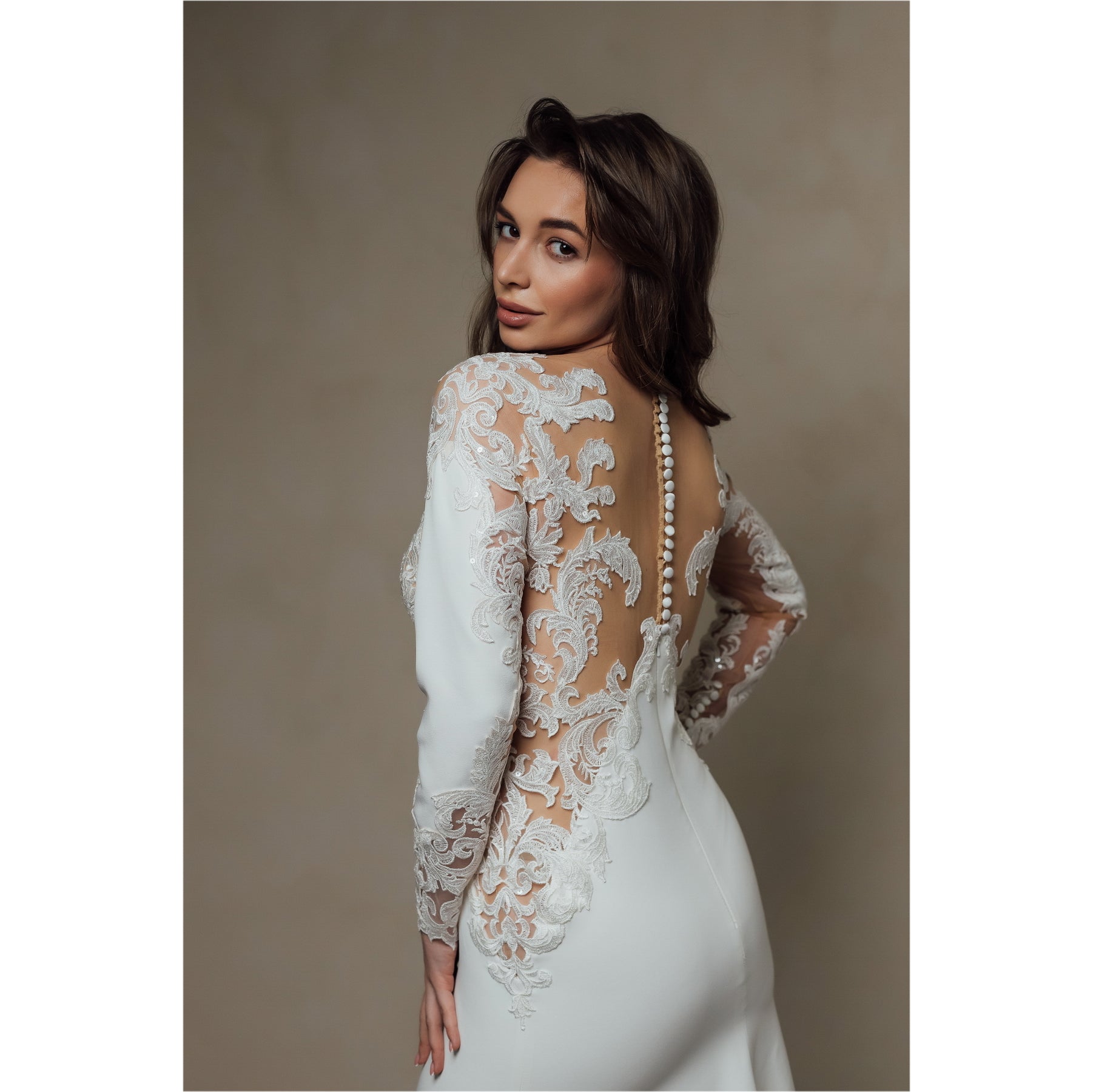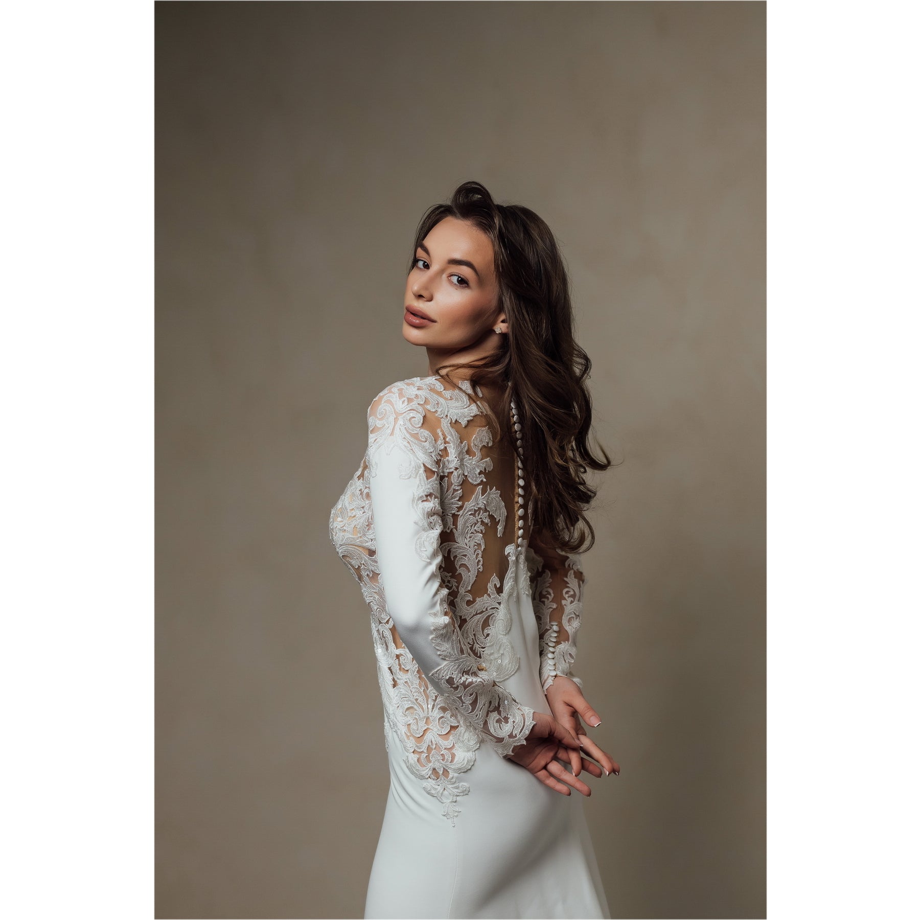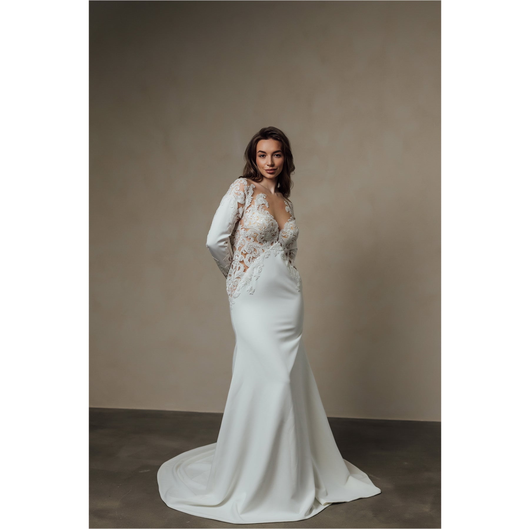 Siamo lieti di presentarvi il nostro eccezionale abito da sposa in triplo crepe, stile sirena, con parti trasparenti ricoperte da un pizzo prezioso per un effetto spettacolare di "vedo non vedo". Grazie e non vediamo l'ora di farvi provare questo straordinario abito da vicino.