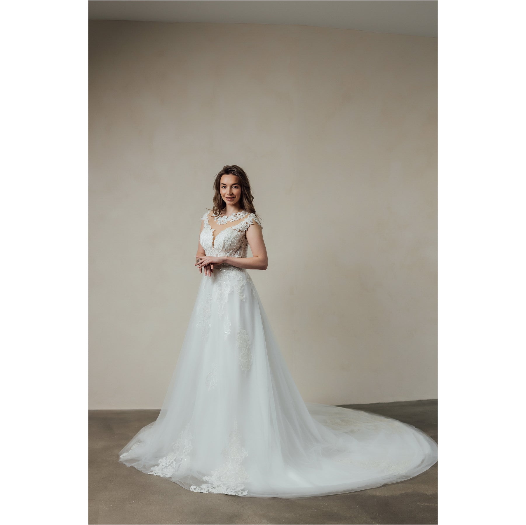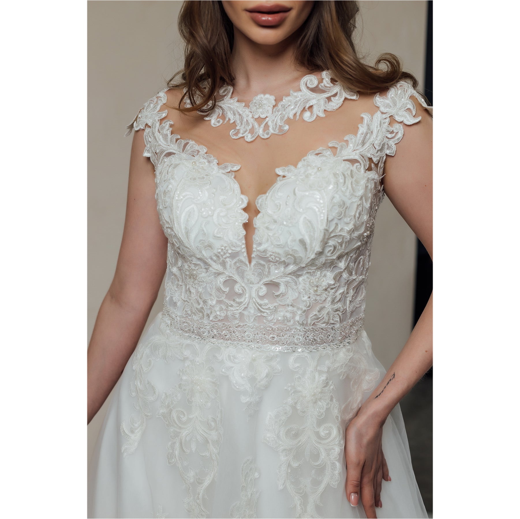 Presentiamo con entusiasmo il nostro straordinario abito da sposa in tulle, stile A-line, con corsetto dal décolleté a forma di cuore e spalle decorate in modo unico. Le applicazioni di pizzo sull'intera gonna aggiungono un tocco elegante e romantico. Questa scelta perfetta per un look incantevole nel giorno del matrimonio. Grazie e non vediamo l'ora di farvi provare questo splendido abito.