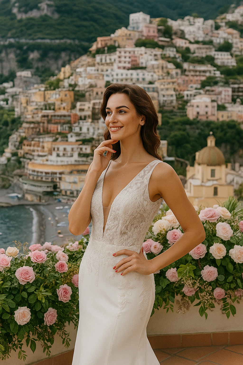 Questo abito da sposa è realizzato in crepe e presenta una silhouette a sirena che esalta la figura femminile. Ha una leggera coda che crea un look sofisticato e romantico. Il corsetto è dotato di bretelline per garantire stabilità e comfort durante la cerimonia. La scollatura profonda a forma di v mette in risalto le spalle scoperte, creando un'estetica sensuale e alla moda. L'abito è ornato con un'applicazione a mano di pizzo di alta qualità che scende sui fianchi, aggiungendo un tocco di eleganza e raffinatezza. Questo abito da sposa è perfetto per le donne che vogliono sentirsi belle e sofisticate il giorno delle loro nozze.