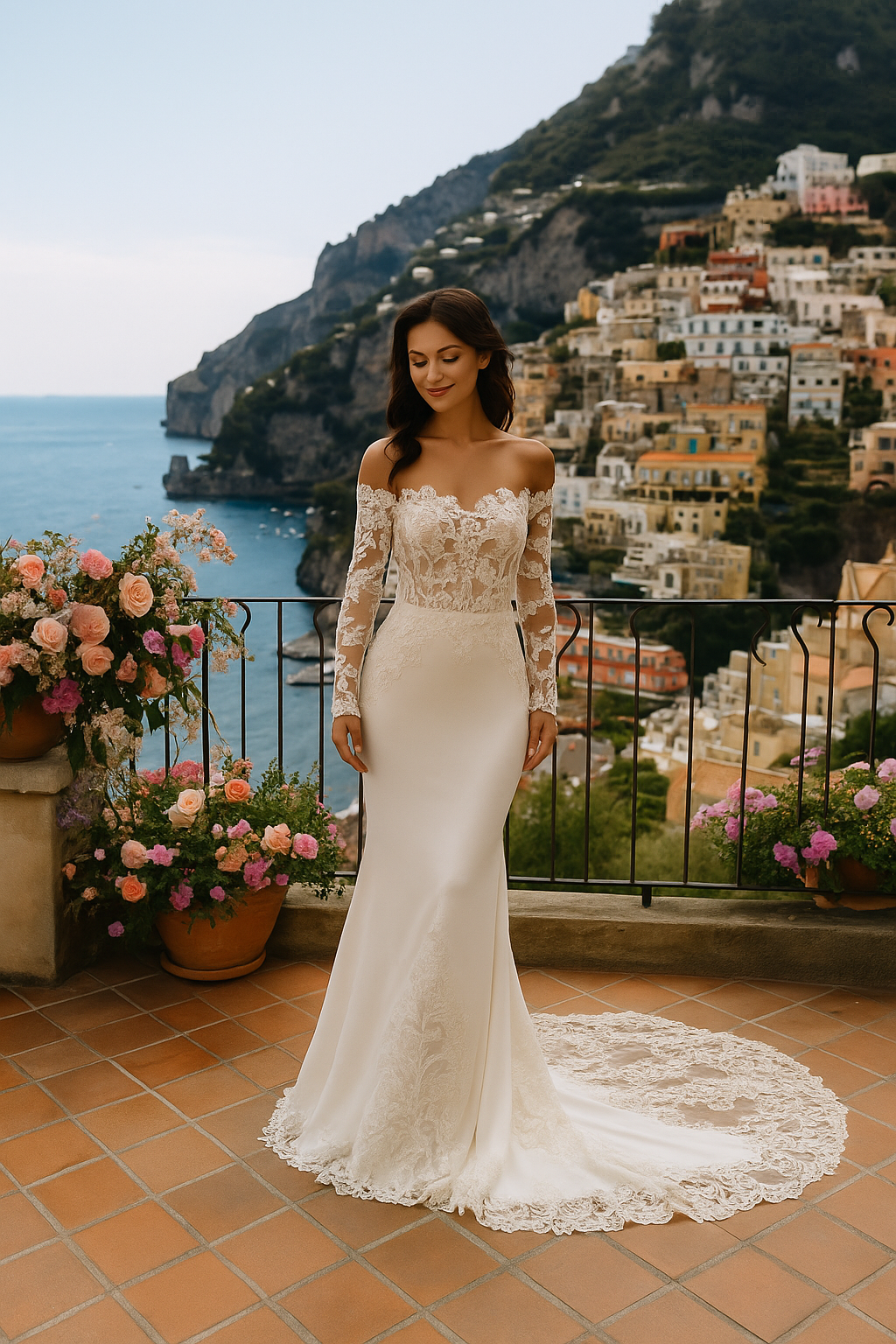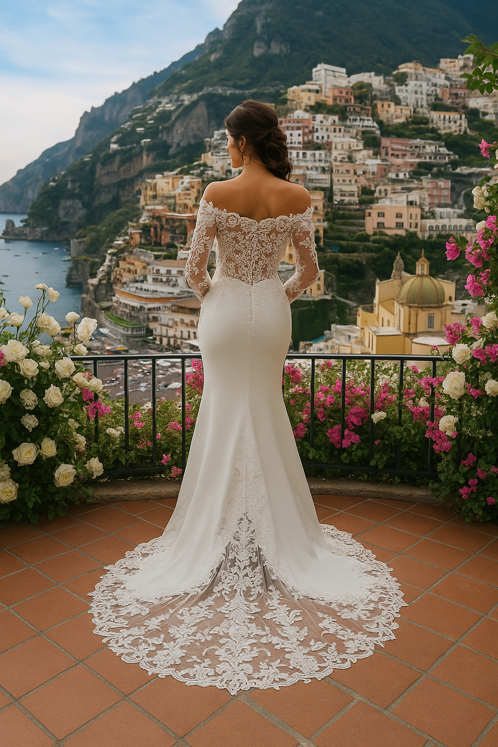 La seduzione delle spalle nude e paradisiaci inserti in pizzo si uniscono in questo spettacolare stile a sirena in soffice crepe. Con maniche e corpetto effetto tattoo e un delicato strascico smerlato.