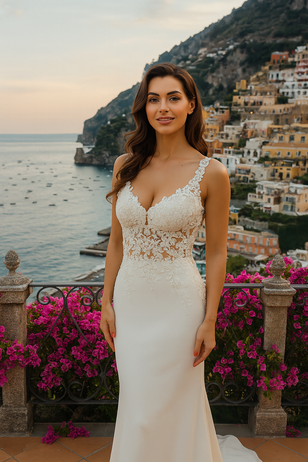 Impressionante e SEXY! Con una gonna in liquida crepe che sembrerà essere stata cucita sul tuo corpo e un corpetto con fattore sorpresa in delicato pizzo su uno strato di tulle color carne. Gli spacchi laterali e un'ampia apertura a oblò sulla schiena creano un effetto abbagliante!