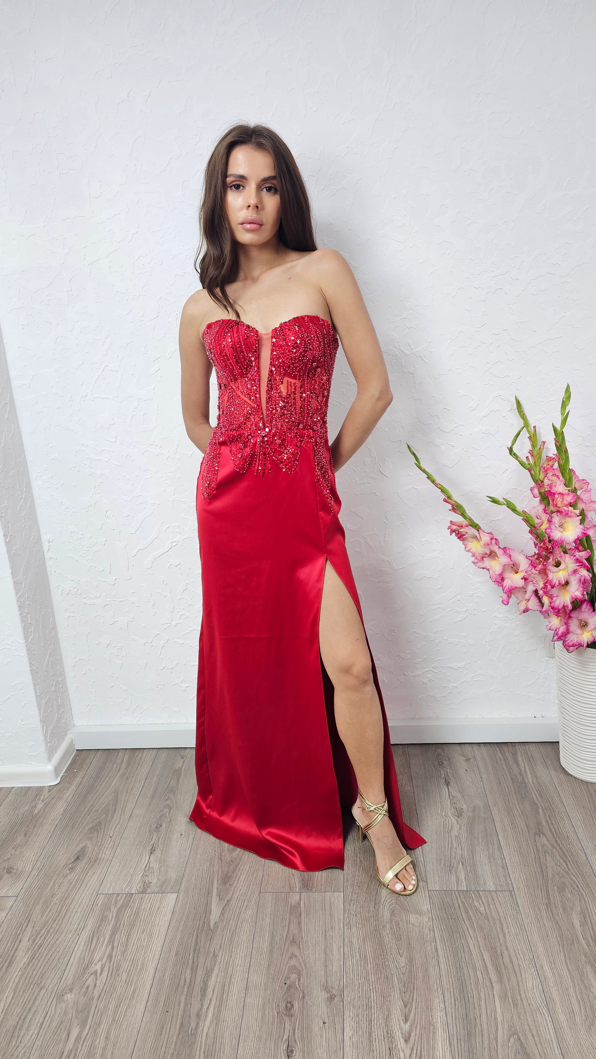 Passione Scarlatta: Questo abito rosso rappresenta l'apice dell'alta moda artigianale. Il corpetto, riccamente decorato con ricami e paillettes tono su tono, esalta la silhouette con eleganza. La gonna lunga e fluente aggiunge un tocco di maestosità, rendendo ogni passo un momento indimenticabile. Perfetto per serate di prestigio.