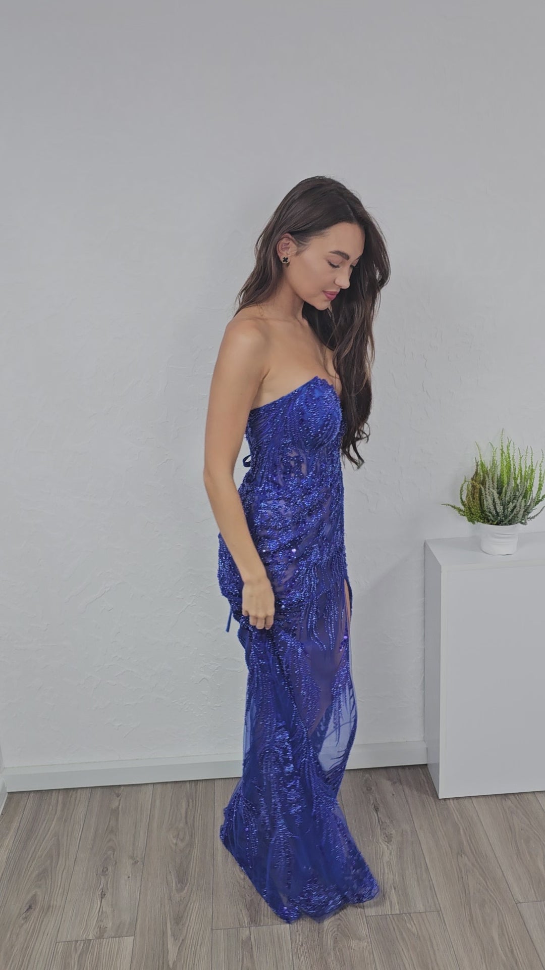 Questo raffinato abito blu cobalto, interamente fatto a mano nel nostro atelier, si distingue per il suo design seducente e sofisticato. Il bustino con profonda scollatura a cuore e i ricami luminosi si fondono in un insieme armonioso che esalta la femminilità. Lo spacco audace lungo la gonna è perfetto per creare un effetto scenico ad ogni passo, rendendo questo abito ideale per una serata di grande impatto.