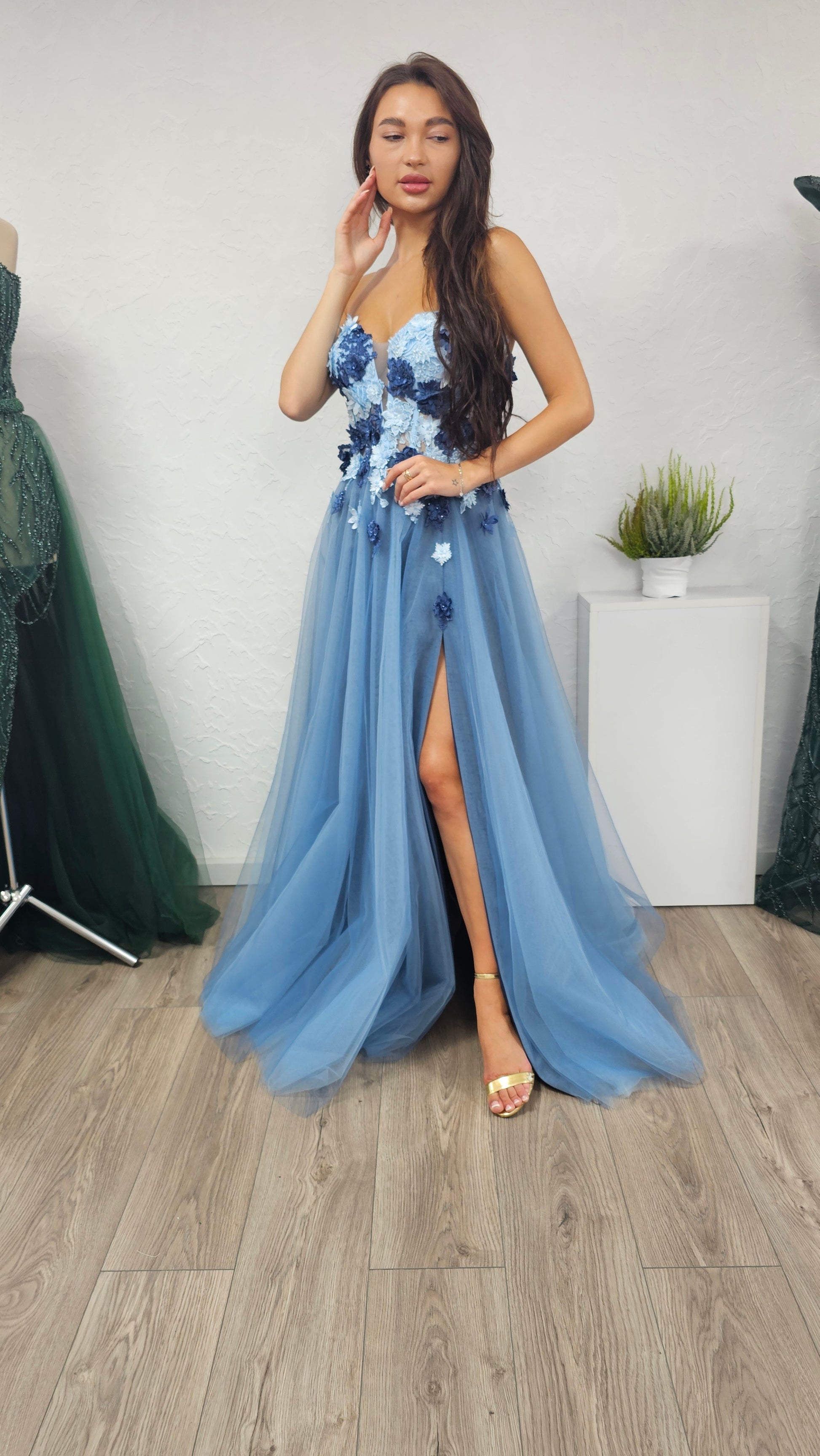 Abito artigianale incantevole, creato con cura nel nostro atelier. Questo splendido vestito in tonalità azzurre è realizzato con tessuti di alta qualità e decorato con applicazioni floreali tridimensionali in diverse sfumature di blu, che aggiungono un tocco di eleganza e raffinatezza. Il bustino a cuore accentua delicatamente la figura, mentre la gonna di tulle fluida cade leggera fino a terra, creando un effetto etereo. Lo spacco laterale dona un tocco audace e sensuale, mentre la meticolosa lavorazione artigianale esalta l'unicità di questo capo. È l'abito perfetto per una donna che desidera sentirsi speciale in ogni occasione.