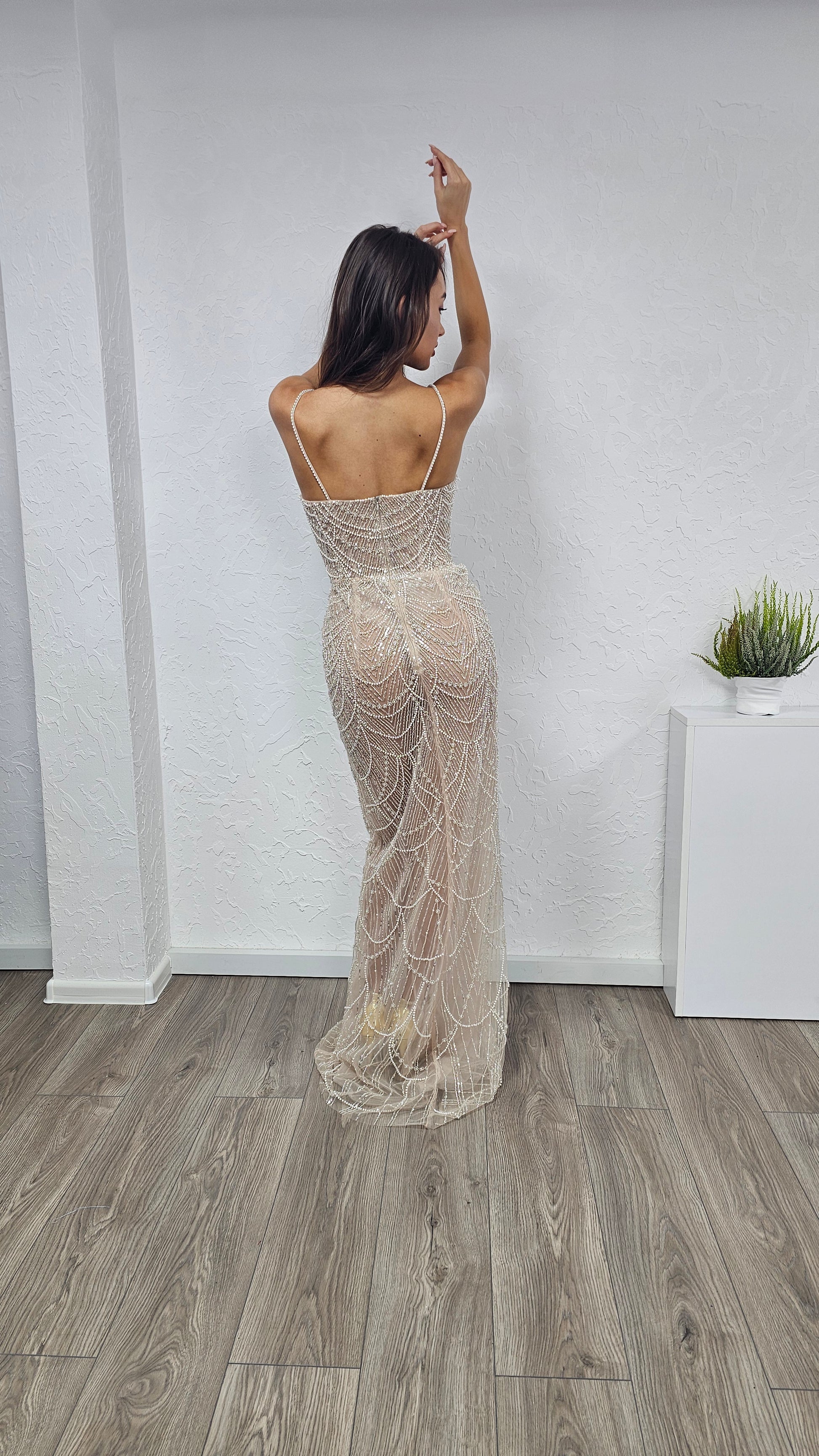Questo abito fatto a mano nel nostro atelier è un capolavoro di eleganza e precisione. Il tessuto decorato con ricami elaborati e perle luminose esalta la figura, mentre il delicato colore nude richiama la freschezza e la serenità. Il bustino a cuore creano un equilibrio perfetto tra femminilità e modernità. Ideale per eventi di gala o cerimonie, per una donna che desidera farsi notare.
