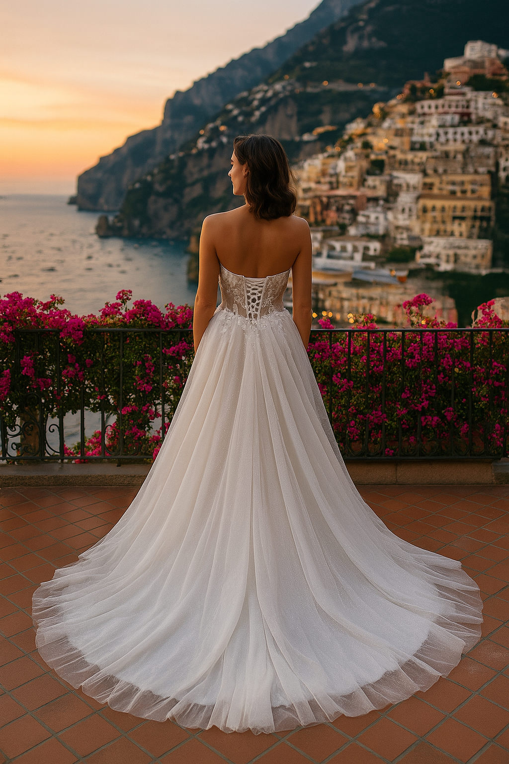 Questo abito da sposa combina eleganza e raffinatezza con un tessuto in tulle leggero, inserti di glitter per uno sfavillante effetto luminoso. Lo stile A line della gonna, con uno spacco elegante, conferisce un tocco moderno. Il corsetto con spalle scoperte, decolleté a cuore e pizzo unico aggiunge romanticismo e sensualità. La chiusura con zip YKK e lacci assicurano la perfetta vestibilità. Un'opzione ideale per un look elegante, raffinato e seducente in occasione di un matrimonio.