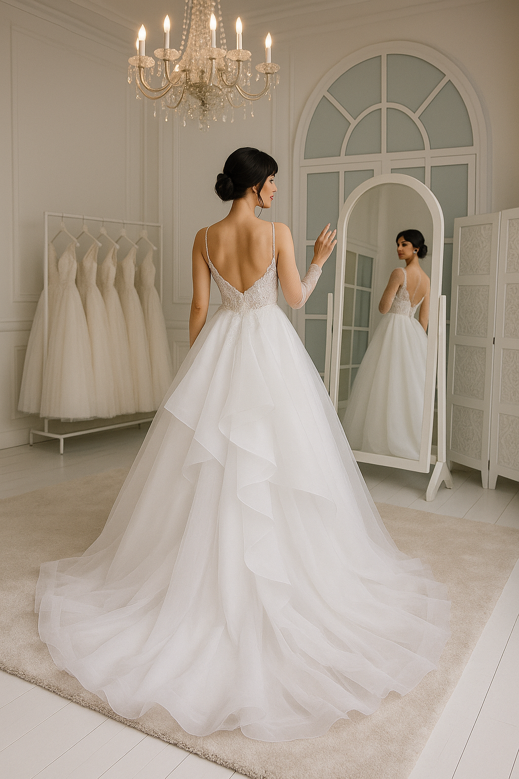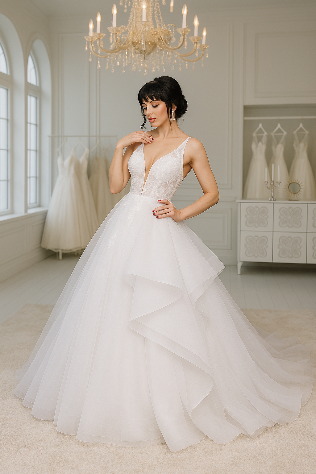 “Regale charme: corpetto in pizzo e gonna volumetrica di tulle che fluisce in un romantico strascico da fiaba.”