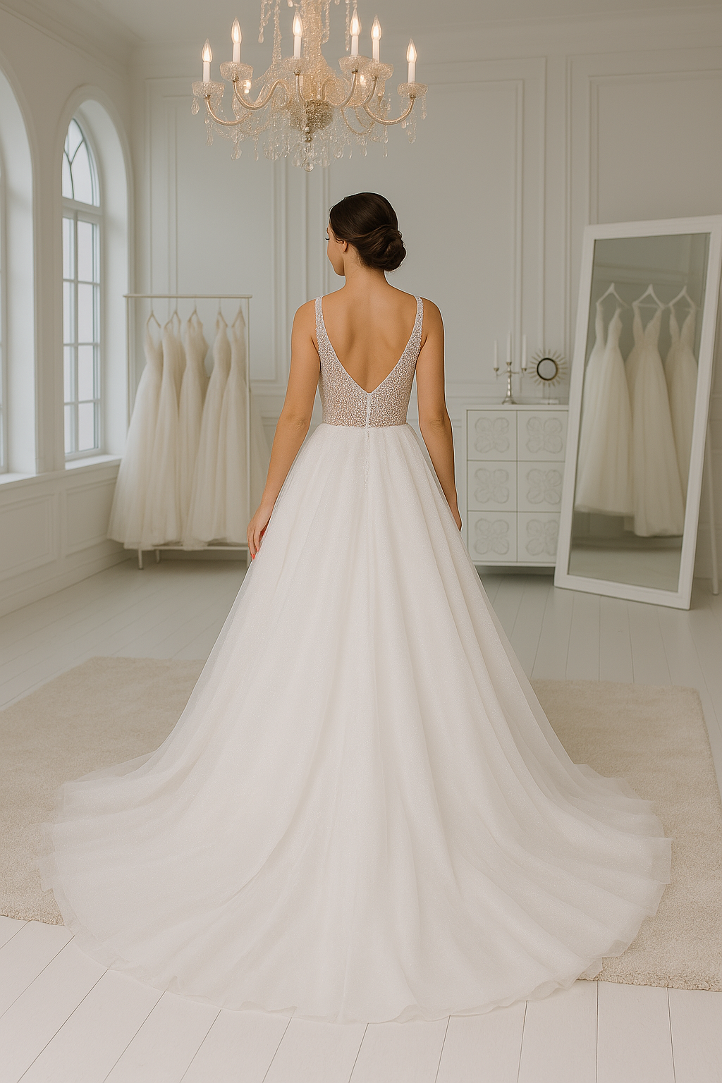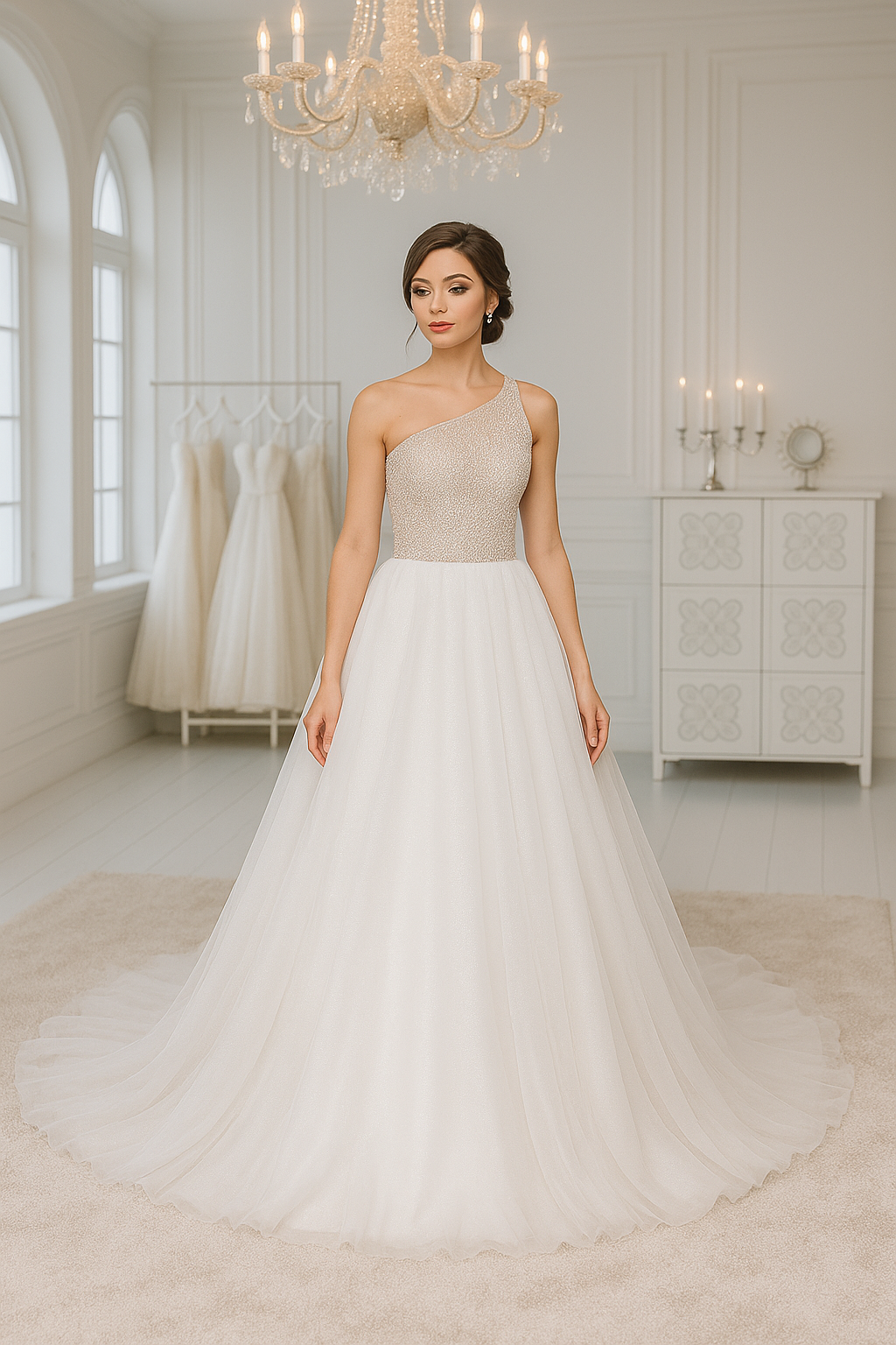 Abito da sposa asimmetrico con monospalla impreziosita da cristalli, corpetto trasparente ricamato e ampia gonna in tulle scintillante: perfetto mix di modernità e romanticismo.
