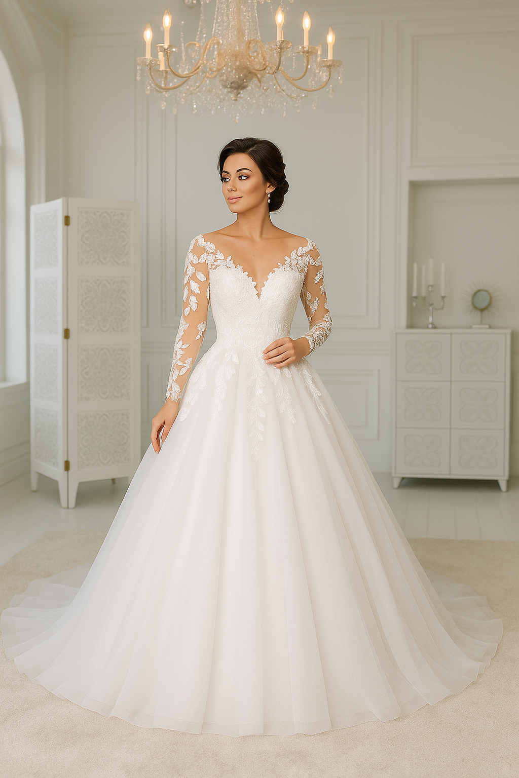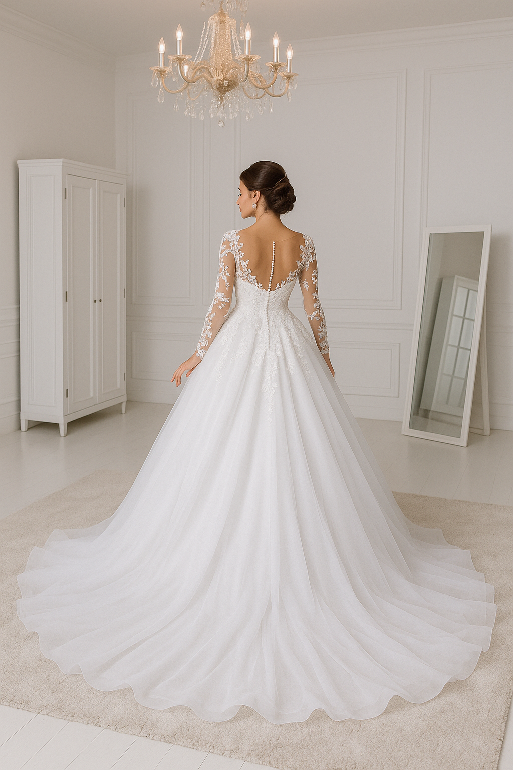 “Elegante abito da sposa con corpetto in pizzo ricamato, maniche lunghe trasparenti e ampio strascico in tulle: il perfetto connubio tra charme romantico e stile senza tempo.”