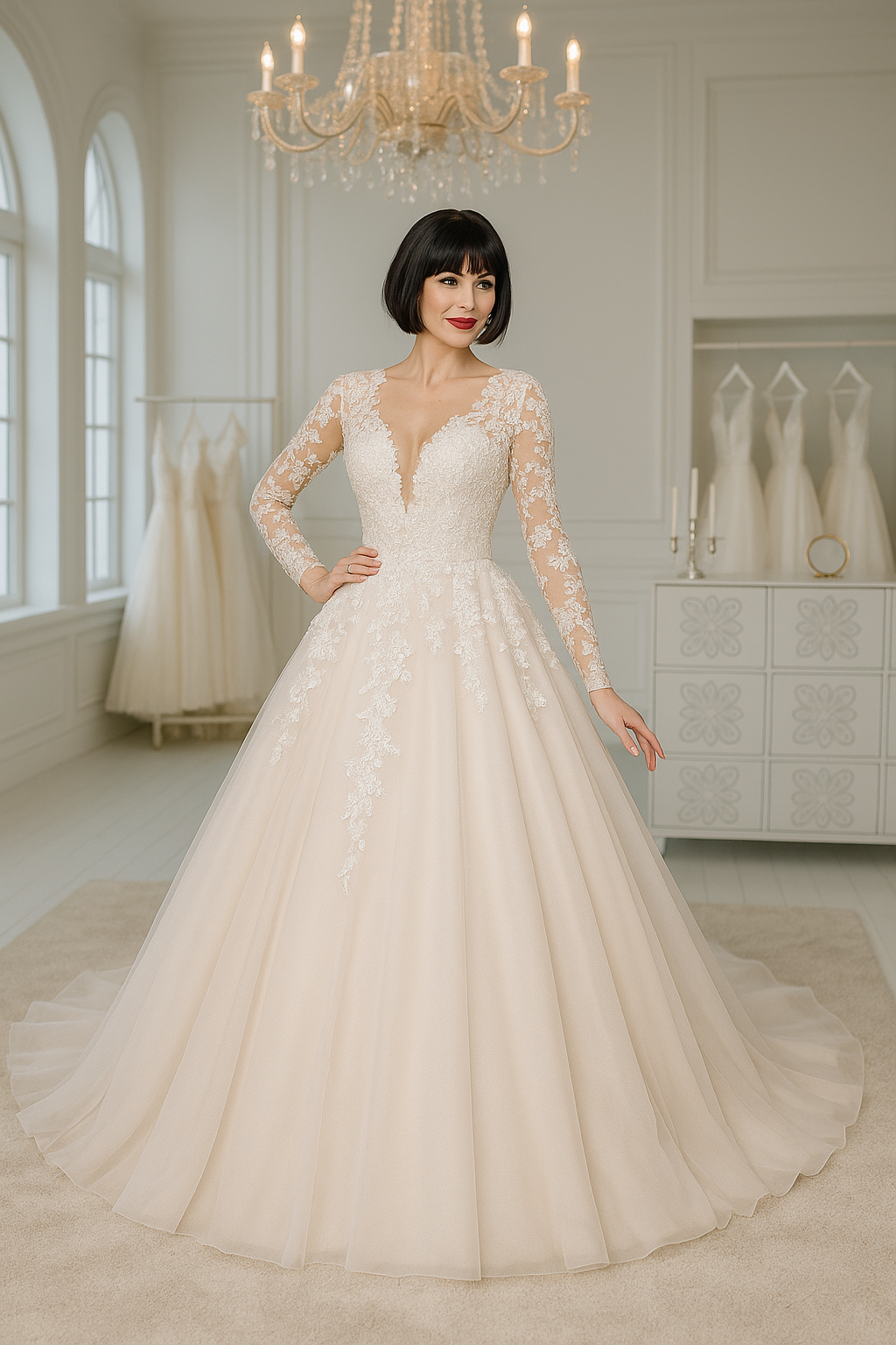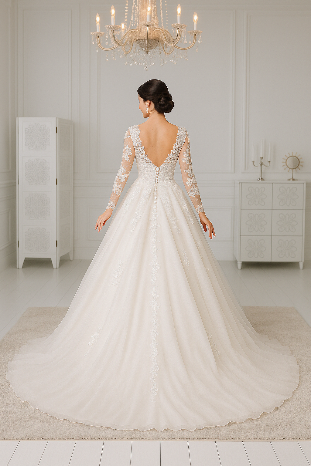 “Incantevole abito da sposa con corpetto in pizzo trasparente, maniche lunghe ricamate e ampio strascico in tulle. Un perfetto equilibrio tra eleganza romantica e raffinatezza senza tempo.”