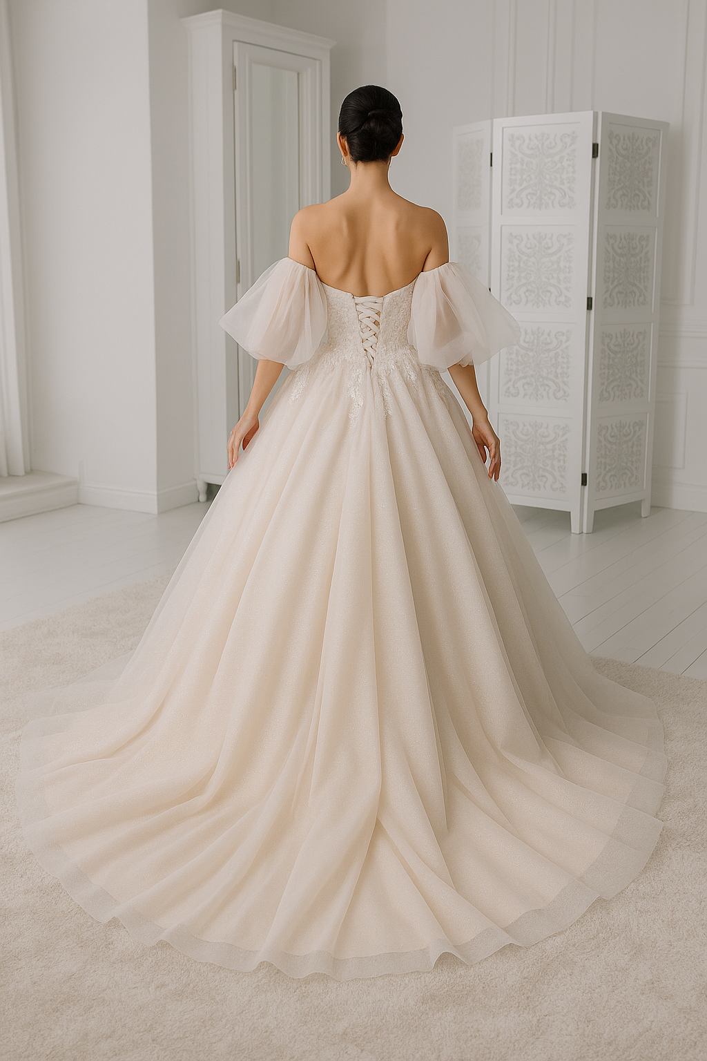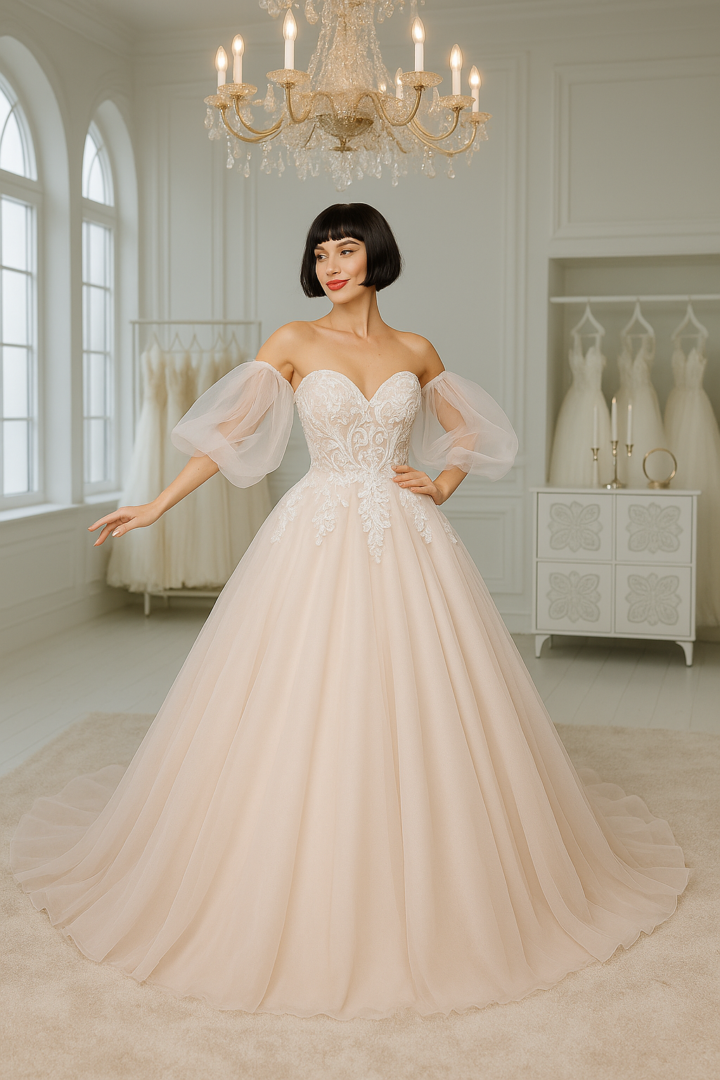 Un abito principesco scintillante, dove ogni dettaglio in tulle e pizzo si accende di riflessi perlati. Le maniche a sbuffo leggerissimo donano un tocco di leggerezza, mentre il corpetto a cuore incornicia il décolleté con un motivo floreale in rilievo. Perfetto per la sposa che desidera brillare nel giorno più importante, circondata da un’aura di fiaba.
