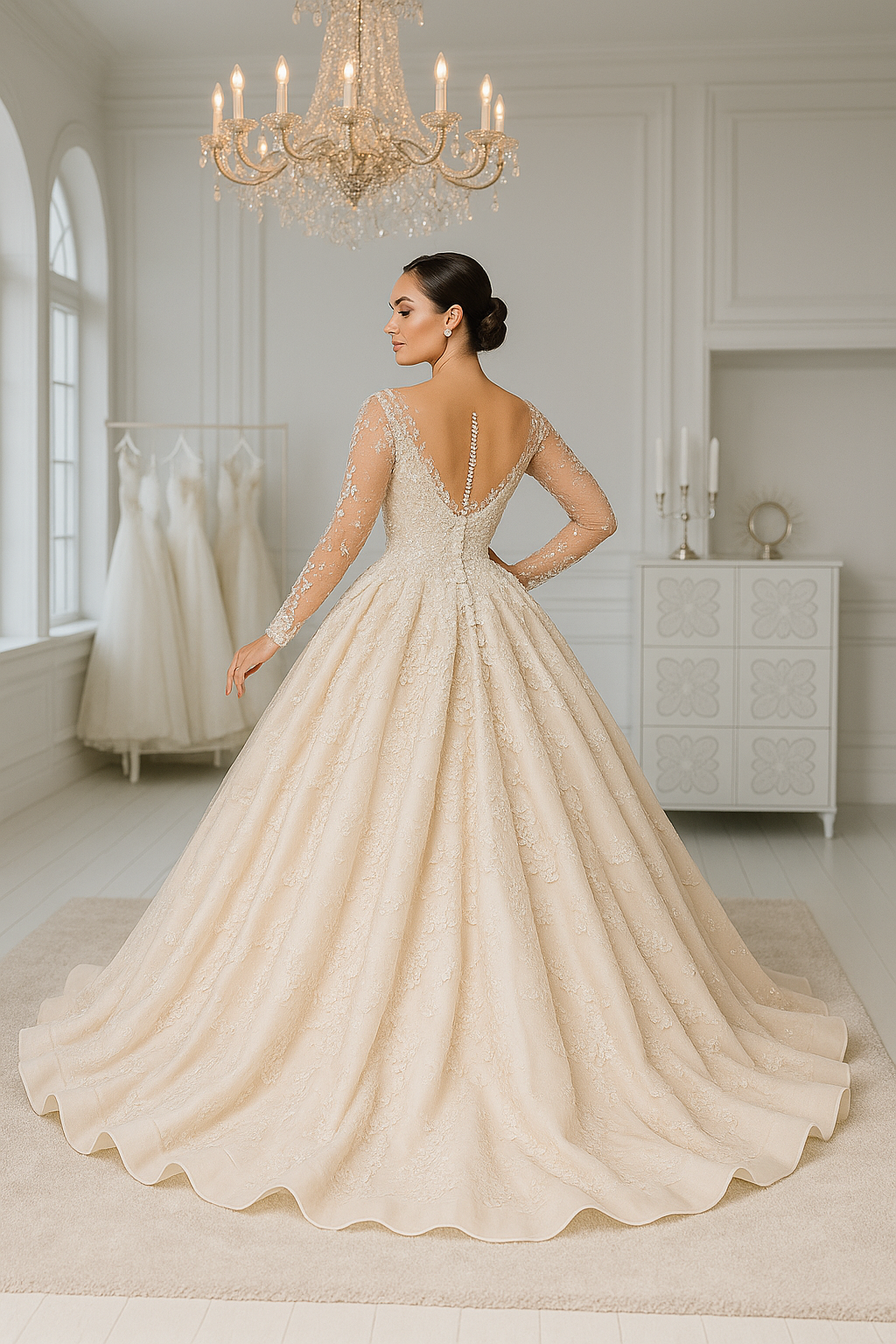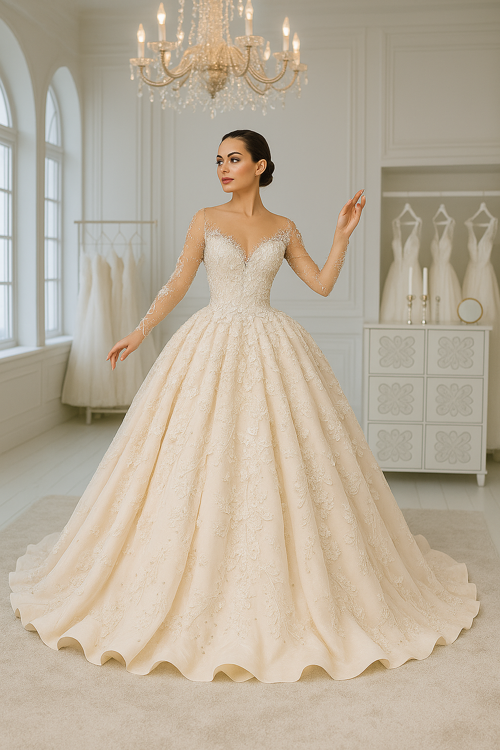 Perfetto per chi sogna un matrimonio da gran cerimonia, questo modello regala movimenti flessuosi e tocchi di scintillio in ogni dettaglio.