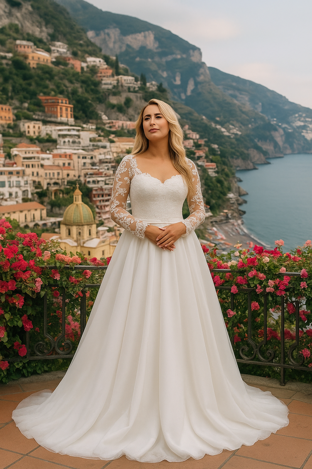 L'abito da sposa in tulle stile A line è un'esplosione di eleganza e raffinatezza. Il corsetto steccato sottolinea la silhouette, mentre le maniche lunghe in tulle skin, decorate con pizzo con effetto tattoo, creano un effetto sofisticato e chic. La schiena è un vero e proprio pezzo forte dell'abito, con una decorazione originale in pizzo decorato a mano a forma di cuore, sempre con effetto tattoo. La chiusura con zip YKK e i piccoli bottoni ricoperti dello stesso materiale garantiscono una vestibilità perfetta e una facilità d'uso. Questo abito è l'ideale per una sposa che cerca un look romantico e sensuale per il suo giorno speciale.