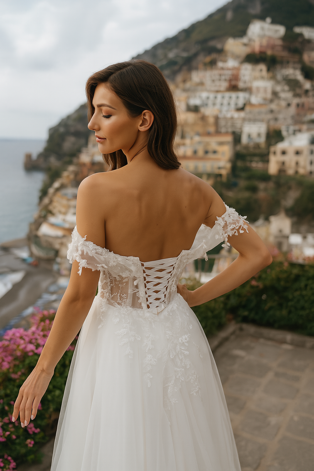 Questo abito da sposa è realizzato in tulle, un tessuto leggero e delicato che crea un effetto di leggerezza e sensualità. Il corsetto è steccato in tulle off-white, un tessuto morbido ed elegante che dona un tocco di sofisticatezza all'abito. Le maniche cadute lasciano le spalle scoperte, creando un effetto molto sensuale. La decoltè è ampia, per un effetto di eleganza e raffinatezza. La chiusura si trova sulle spalle con bottoni e lacci, un particolare molto originale ed elegante. L'abito deve essere aderente per creare una silhouette elegante e sottile.