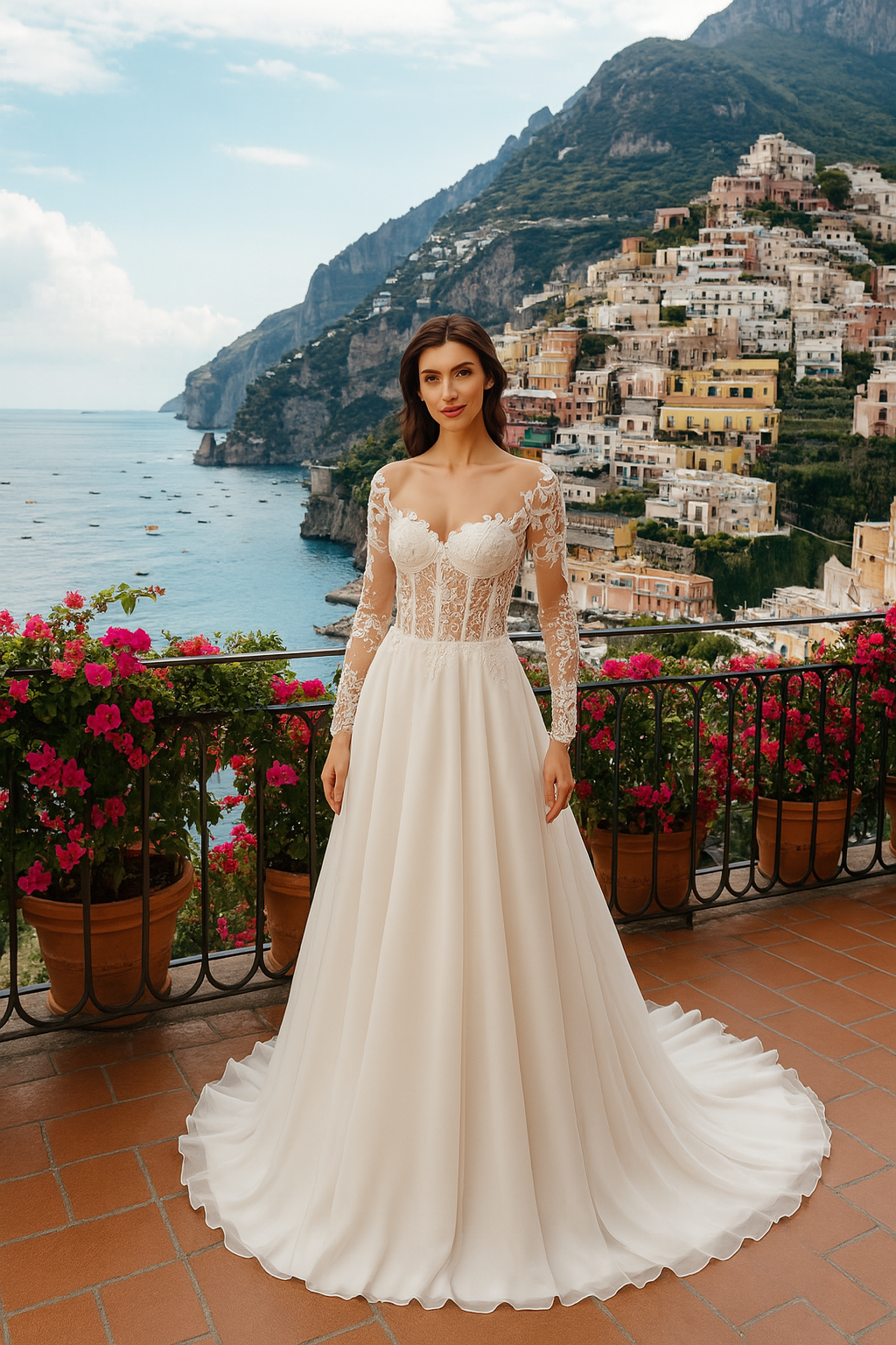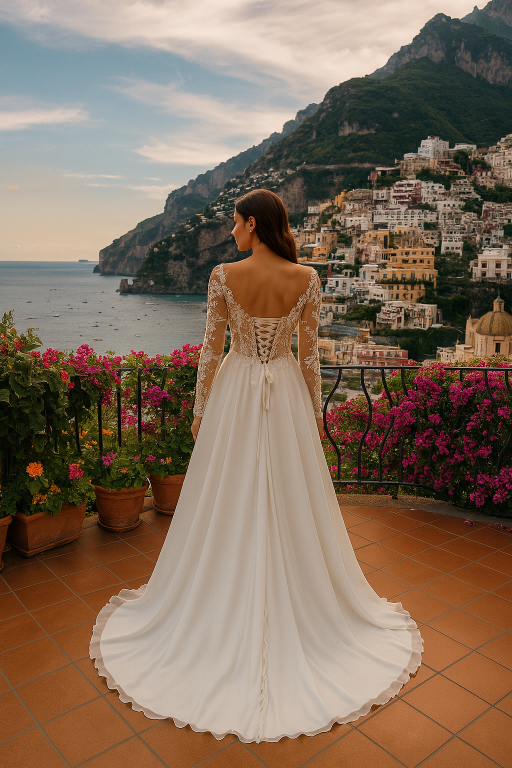 Questo abito da sposa è realizzato in shiffon, un tessuto leggero e delicato che crea un effetto di leggerezza e sensualità. Il corsetto è steccato in tulle off-white, un tessuto morbido ed elegante che dona un tocco di sofisticatezza all'abito. Le maniche lunghe sono decorate con un ricamo a mano con pizzo prezioso, creando un effetto di eleganza e raffinatezza. La chiusura si trova sulle spalle con bottoni e lacci, un particolare molto originale ed elegante. L'abito deve essere aderente per creare una silhouette elegante e sottile.