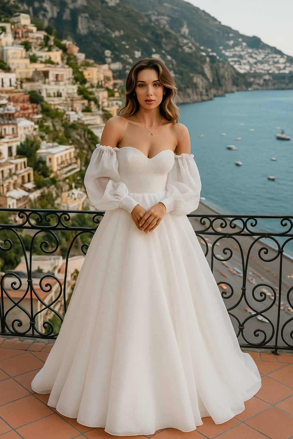 Questo abito da sposa in tulle ha uno stile che combina il tradizionale stile principesco con il più moderno stile A-Line. Il corsetto ha una forma a cuore e spalle scoperte, con maniche a sbuffo staccabili che possono essere indossate per un look più formale o rimosse per un'occasione più informale. Il corsetto è decorato con prezioso pizzo e ha una struttura steccata che definisce la vita. La gonna è ampia e morbida, con una chiusura con cerniera YKK. Il corsetto può essere chiuso con lacci o bottoni a scelta. In generale, questo abito da sposa in tulle ha un equilibrio perfetto tra tradizione e modernità, con dettagli romantici e sofisticati che lo rendono ideale per un matrimonio durante il giorno o la sera.