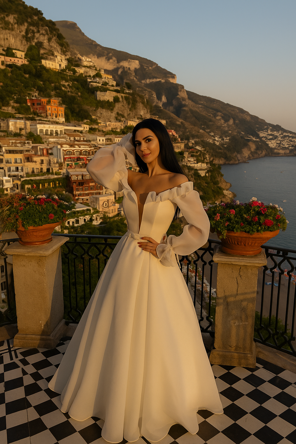 Questo abito da sposa è realizzato in tafta, un tessuto morbido e leggero che crea un effetto voluminoso e arioso. La forma A-line si adatta perfettamente a molte figure, poiché si allarga dalle spalle alle ginocchia per creare una silhouette elegante e femminile. Il corsetto presenta un design molto originale che evidenzia la silhouette e mette in risalto la parte superiore del corpo. L'apertura tra i seni che arriva alla vita è un tocco sensuale e moderno, mentre le maniche lunghe sbuffate in chiffon aggiungono un elemento di eleganza e delicatezza all'abito.